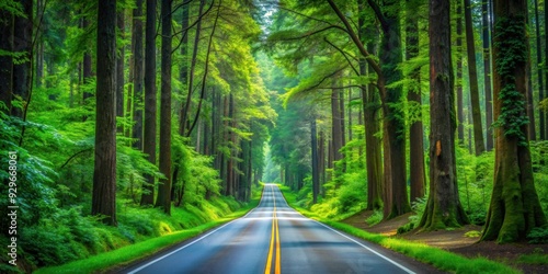 Obraz premium Scenic highway through lush forest with towering trees and vibrant greenery,...