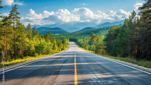 © Alexander Kurilchik, Naklejka premium Scenic Highway Through Lush Forests and Mountains Under a Bright Blue Sky