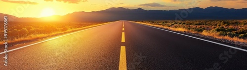 © narak0rn, Naklejka premium Scenic highway under vibrant sunset with mountains in the background and clear sky.