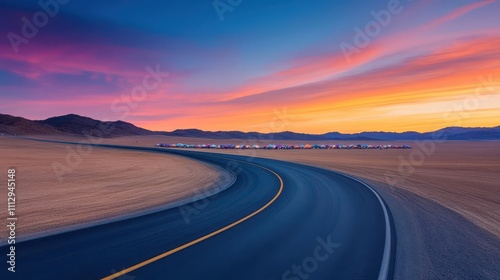 Fototapeta premium Scenic highway winding through a desert landscape, festival tents visible in the distance under colorful skies