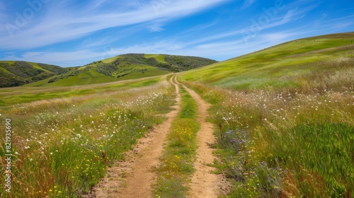 Obraz premium Scenic hiking trail through lush green hills and meadows