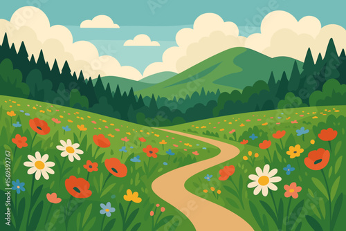 Fototapeta premium Scenic Hiking Trail Through Wildflower Meadow, Rolling Hills, Pine Forest, Blue Sky, Modern Flat Vector Illustration, Nature Landscape, Outdoor Adventure, Spring Summer Field