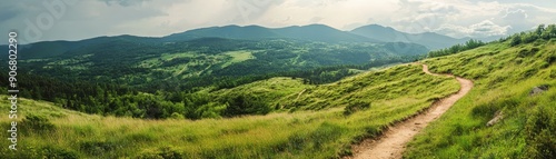 Fototapeta premium Scenic hiking trail winding through lush green hills and mountains under a...