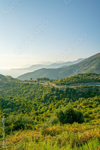 © Fineshot, Fototapeta premium Scenic hillside with winding road leading towards sea and layered mountain ridges fading in horizon under bright blue sky in warm daylight