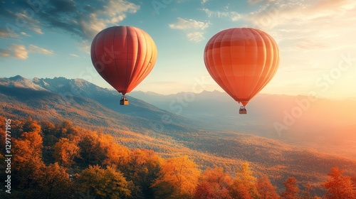 © Artajar, Fototapeta premium Scenic Hot Air Balloon Ride Over Autumnal Forest Landscape at Sunset Adventure and Freedom with Two Balloons on the sky above the mountains