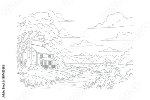 © Jihan, Obraz premium Scenic House by the River Illustration