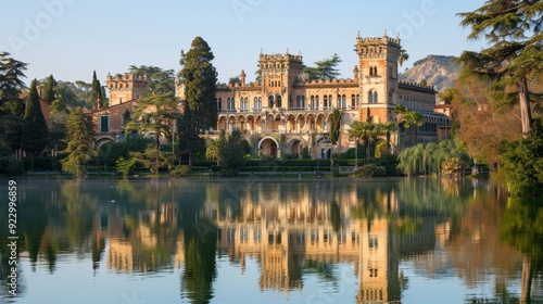 Fototapeta premium Scenic Italian Lakefront Villa Architectural Castle with Reflected Beauty in...