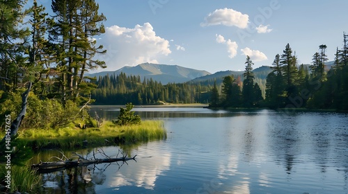 © atar, Fototapeta premium Scenic Lake Landscape With Reflecting Trees Under a Blue Sky and Clouds
