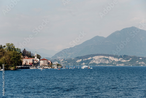 Naklejka premium Scenic Lake Maggiore vista featuring sailboats gliding over azure waters, Belgirate nestled amid dramatic mountain peaks, capturing classic Italian lakeside tranquility