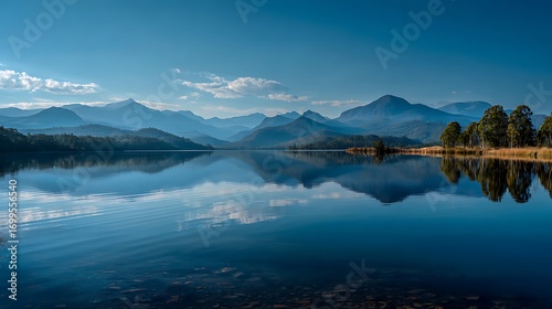© Asad, Obraz premium Scenic lake reflecting mountains and trees on a sunny day with blue sky