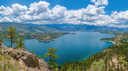 Naklejka premium Scenic lake view surrounded by mountains and clouds.