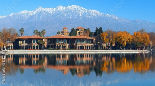 © logyartstudios, Fototapeta premium Scenic Lake View with Building Reflection and Snowy Mountains