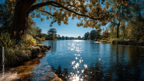 © diaspradina, Naklejka premium Scenic lake view with sunlight reflecting on the water surface amidst trees