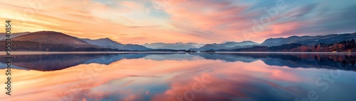 © poom, Fototapeta premium Scenic lake with mountains reflecting in the water during sunset
