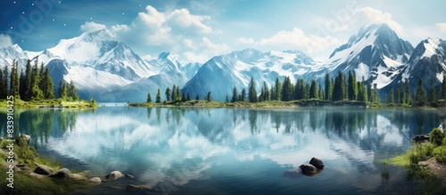 Naklejka premium Scenic lake with stunning mountains as a backdrop, providing a serene copy...