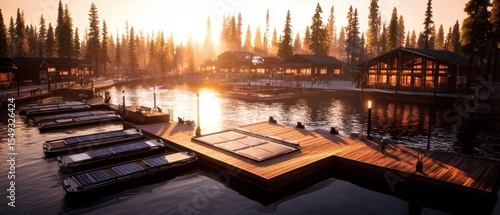 © steadfastontwo, Fototapeta premium Scenic Lakeside Resort at Sunset with Reflection and Warm Colors