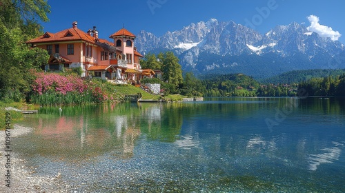 Naklejka premium Scenic lakeside villa surrounded by mountains and vibrant nature on a sunny day
