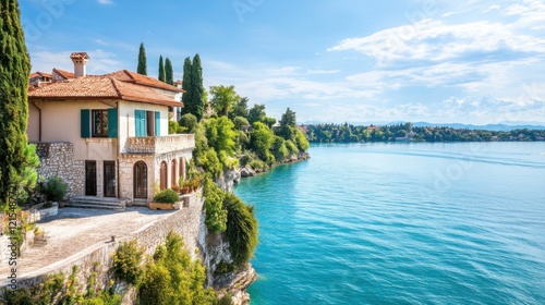 Obraz premium Scenic Lakeside Villa with Elegant Architecture Surrounded by Lush Greenery and Clear Blue Water