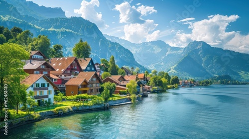 Fototapeta premium Scenic lakeside village surrounded by mountains and lush greenery under a...
