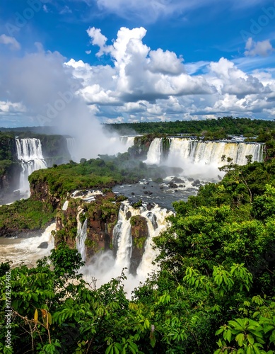 Fototapeta premium Scenic landscape featuring tiered waterfalls, lush greenery, and blue sky