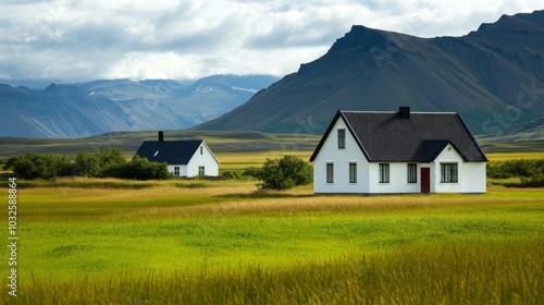 Obraz premium Scenic landscape featuring white houses surrounded by lush green fields and mountains.