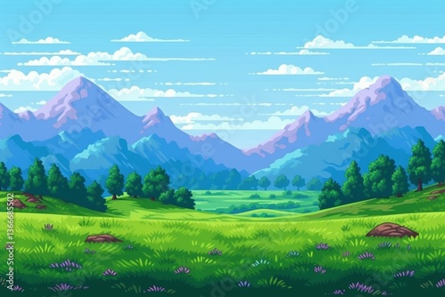 Fototapeta premium Scenic Landscape, hills, green fields and trees under cloudy sky, natural background for digital use