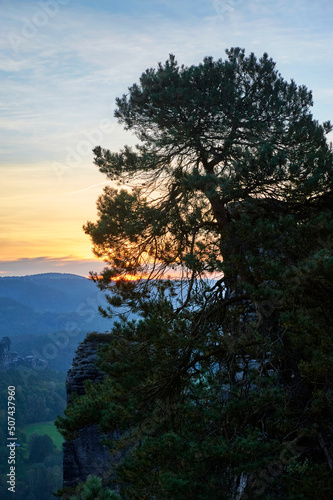 © yorgen67, Obraz premium Scenic landscape in Bastei rocks at sunrise, Germany