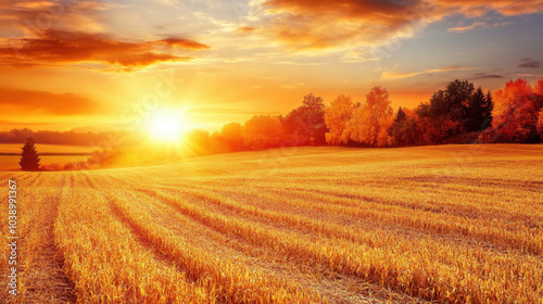 © Сергей Безрученко, Obraz premium Scenic Landscape of a Green Field under Blue Sky