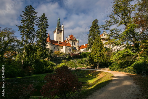 © Lioneska, Fototapeta premium Scenic landscape of famous romantic Pruhonice castle, Czech Republic, Europe, standing on hill in a park, sunny fall day, blue sky, colorful trees, foot path with shadows of trees