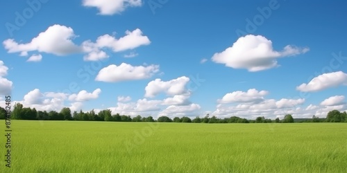 © Nice Seven, Obraz premium Scenic landscape of green grassy field under blue sky with fluffy white clouds and distant trees