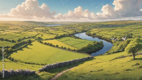 © Sacha, Fototapeta premium Scenic landscape of lush green fields and a winding river under a bright sky with fluffy clouds