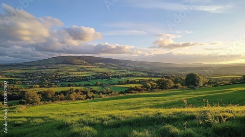 © Kultivad, Obraz premium Scenic landscape of lush green hills and dramatic clouds under a vibrant blue sky during the golden hour of sunset