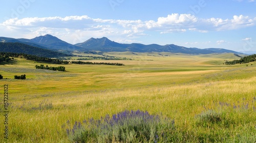 © ADD PHOTO, Fototapeta premium Scenic Landscape of Lush Green Meadow with Purple Wildflowers and Majestic Mountains in the Distance