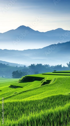 © nitiroj, Fototapeta premium Scenic landscape of rice paddies with misty mountains in the background, highlighting rural development and land investment potential