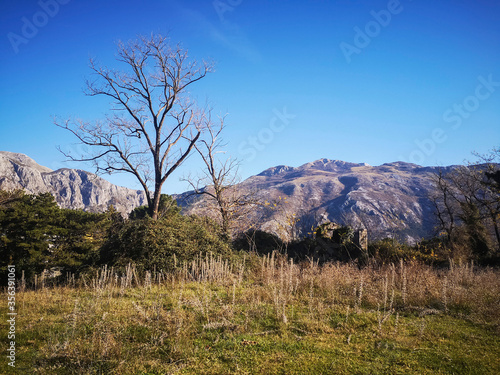 © Aliaksandra, Fototapeta premium Scenic landscape of the mountain and trees from the top of Vrmac mountain in Montenegro on blue sky background, amazing Montenegro nature view