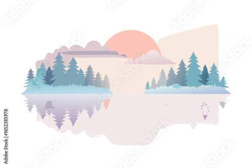 © M, Fototapeta premium Scenic landscape painting of forest lake at sunset with reflection art illustration for print and design