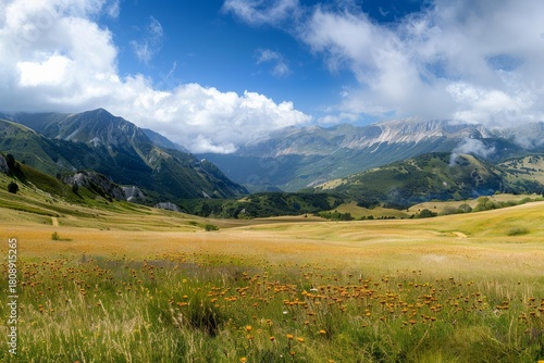 © nsit0108, Obraz premium Scenic landscape showcasing vibrant wildflowers blanketing a plain beneath towering mountains under a summer sky