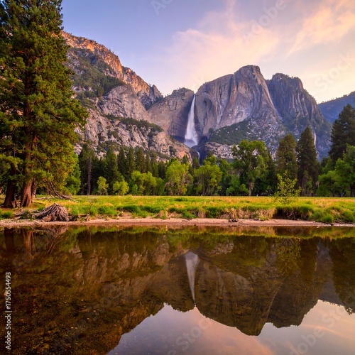 © win, Fototapeta premium Scenic landscape showing mountain range, waterfall, and serene lake reflection