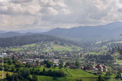Naklejka premium Scenic landscape view of Vorokhta, picturesque mountain village with green...