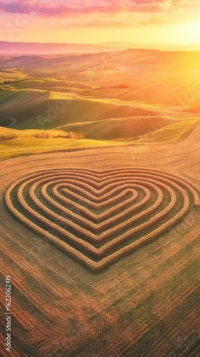 © Safina, Naklejka premium Scenic landscape with a heart-shaped maze in a field during a golden sunset