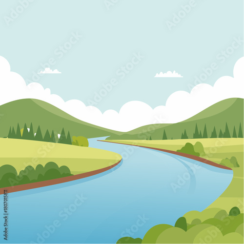 Fototapeta premium Scenic landscape with a winding river, green hills, and a clear blue sky with...