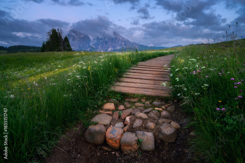 © den-belitsky, Fototapeta premium Scenic landscape with a wooden path, green grass with flowers in Alpe di Siusi with the Sassolungo mountain during a cloudy sunset in the Dolomites, Italy. Alpine mountains at dusk in summer. Nature