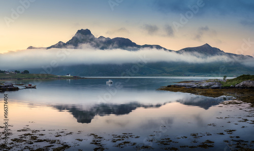 Fototapeta premium Scenic landscape with mountain reflection and low clouds at summer night in Lofoten, Norway