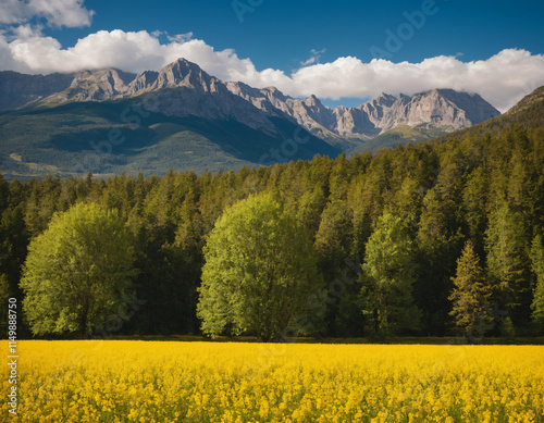 Obraz premium Scenic Landscape with Mountains, Forest, and Yellow Flower Field, Idyllic...