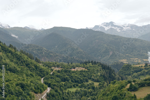© SHOTPRIME STUDIO, Fototapeta premium Scenic landscape with rolling hills and a winding trail through lush greenery, leading to distant mountains under a cloudy sky