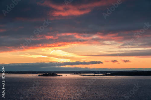 © Jani Riekkinen, Naklejka premium Scenic landscape with sunset and sea at evening in Gulf Of Finland