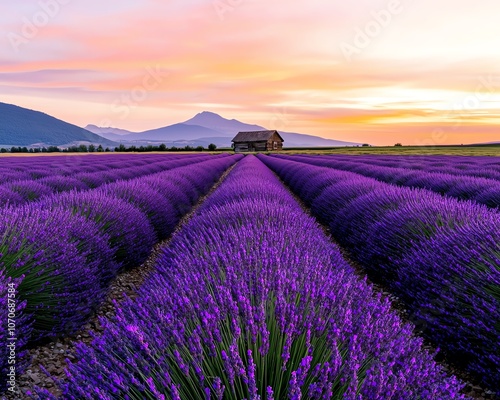 © kang_88_qp, Obraz premium Scenic lavender field at sunrise with a barn in the distance.