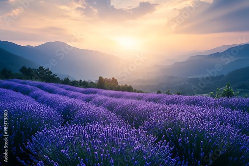 Obraz premium Scenic lavender field at sunset with mountains in background. Peaceful nature...