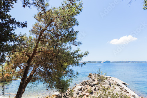 Fototapeta premium Scenic Mediterranean rocky coastline featuring a large pine tree, crystal...