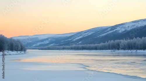 © Rama, Fototapeta premium Scenic Morning on a Frozen Lake with Snow-Capped Peaks
